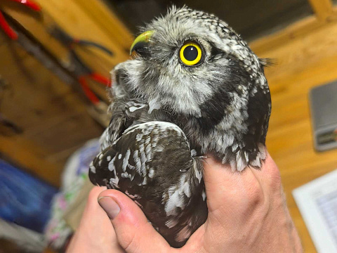 При осмотре птицы кольцевателем оказалось, что в руках орнитологов вид, который ещё ни разу не отлавливался здесь – ястребиная сова (Surnia ulula). Эти птицы обитают на территории Байкальского заповедника и Алтачейского заказника, однако в окрестностях станции кольцевания – то есть, на самом берегу Байкала – они не были отмечены ни разу. Теперь получится собрать больше данных об этих замечательных птицах!